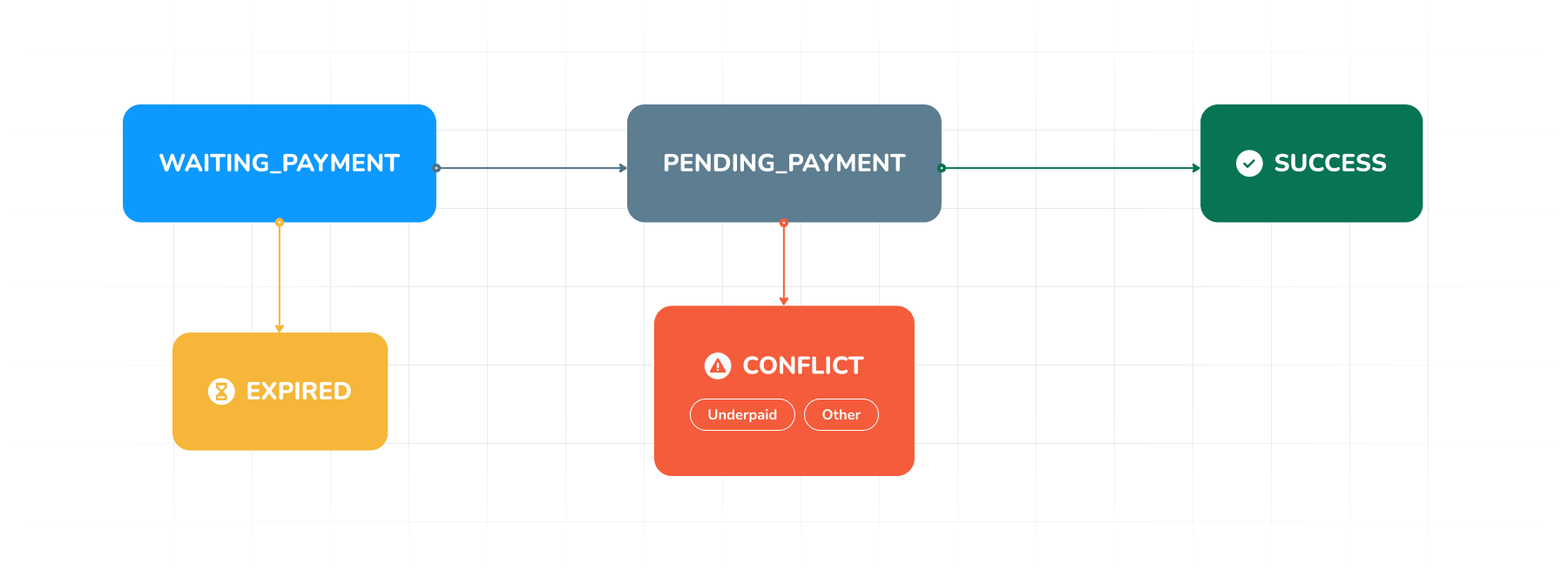 **CONFLICT**: This status occurs when a transaction initiated by the end user is detected and processed, but certain problems are identified. These problems may include discrepancies in the payment amount, such as not meeting the expected value, or failures in compliance checks, like Anti-Money Laundering (AML) regulations. To provide more detailed insight into the issue, a substatus called 'Reason' is used.\